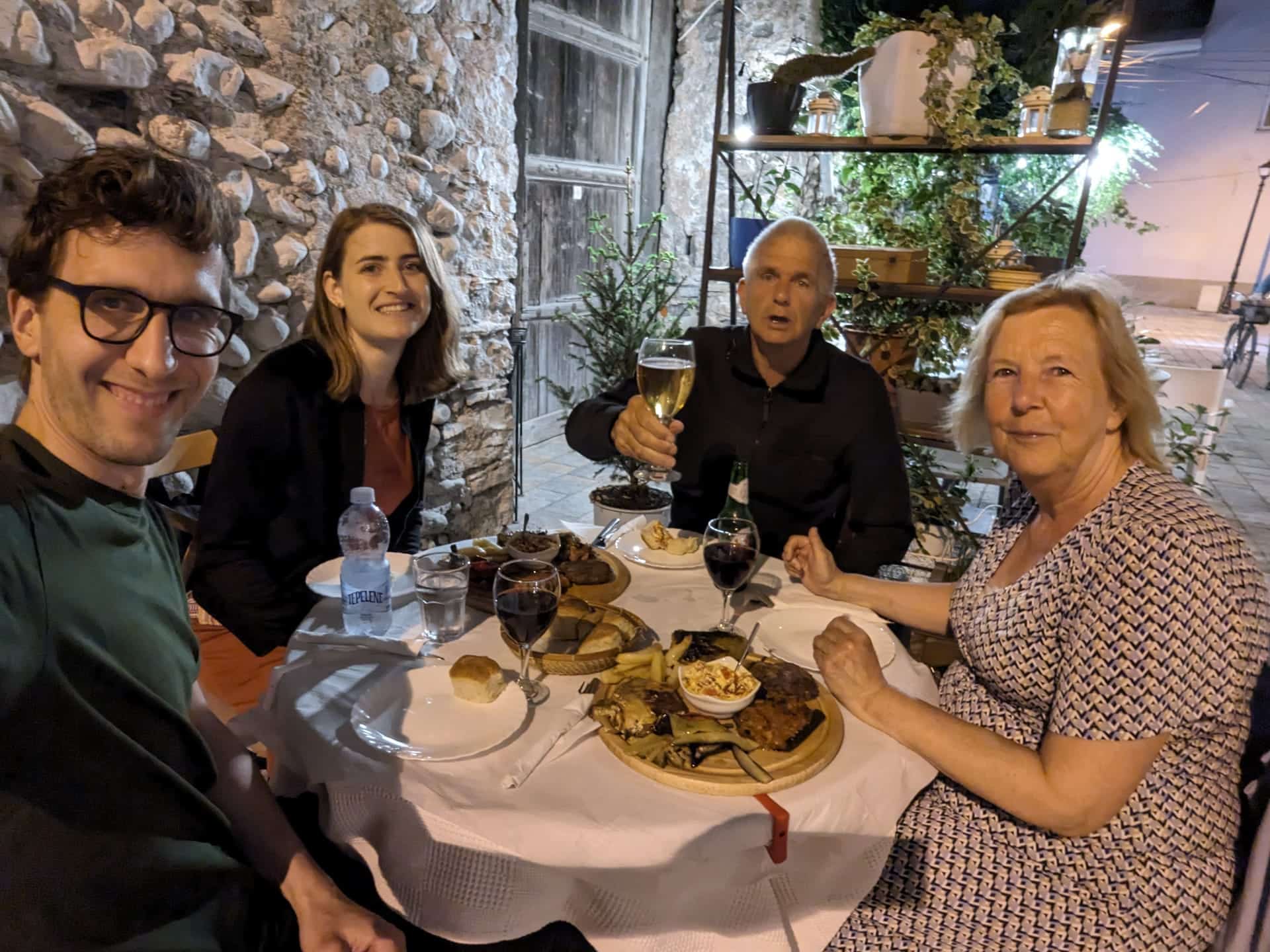 Helemaal blij reden we door naar ons hotel in Shkoder. Na een power nap, opfrissen en een kopje koffie gingen we de stad in. We verkenden dé leuke voetgangsers/toeristen straat en vonden het Albanese eettentje wat Mich had uitgekozen met behulp van een echte fysieke, ouderwetse reisgids. We hadden nog geen idee wat al die gerechten precies inhielden, dus bestelden de ‘mixed plate’ met daarop een proeverij van alles wat er op het menu stond. Dit was ook weer ongelofelijk lekker: gegrilde groenten uit de oven, een gevulde groene paprika, een soort gehaktballen, moussaka, byrek (bladerdeegtaartje) met pompoen, cottage cheese-paprika spread uit de oven, versgebakken brood… En als toetje baklava!