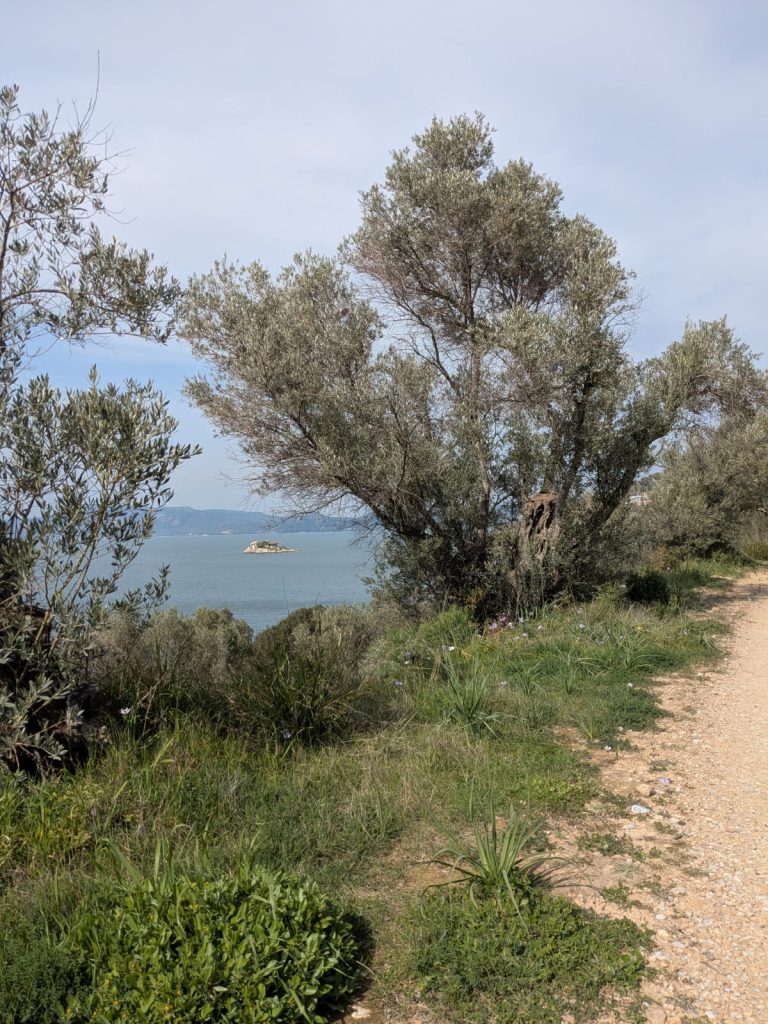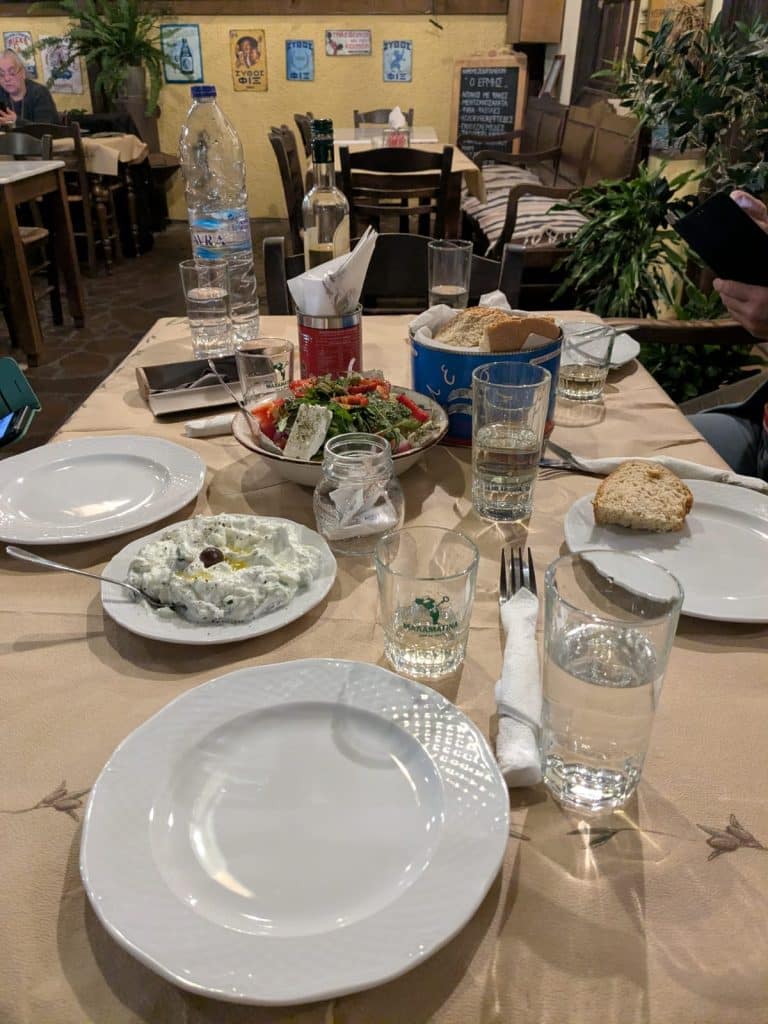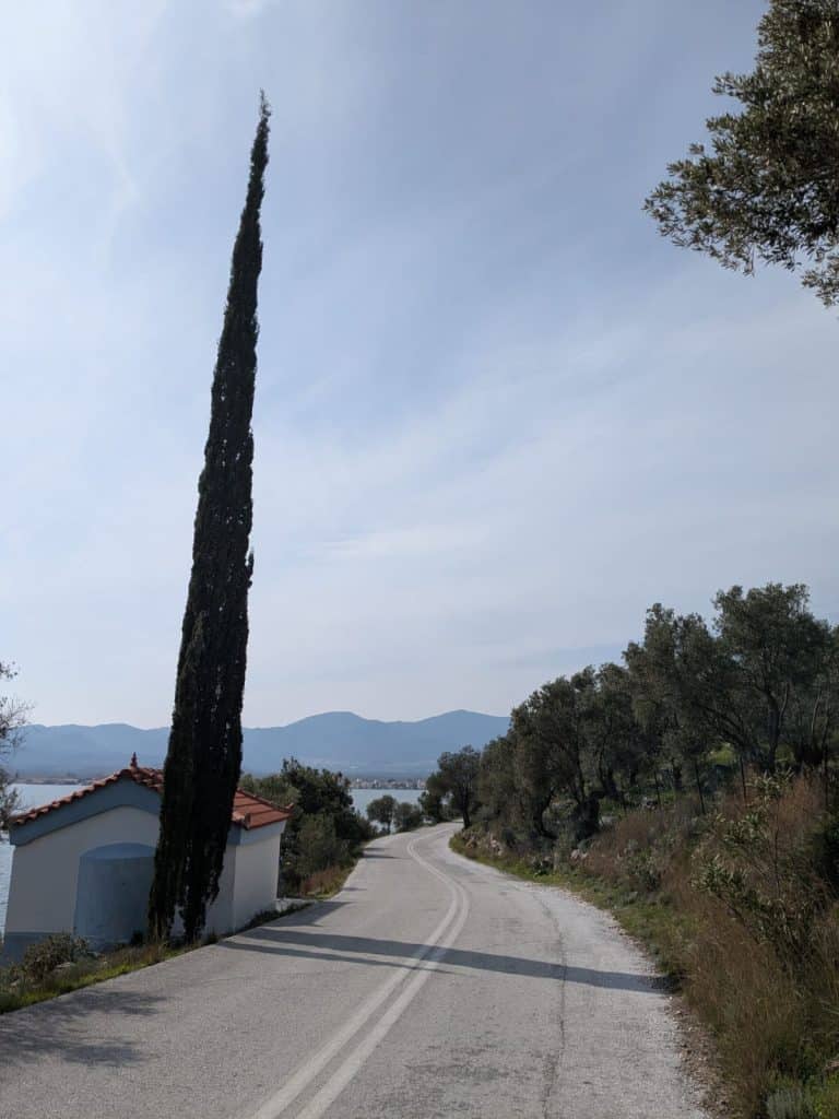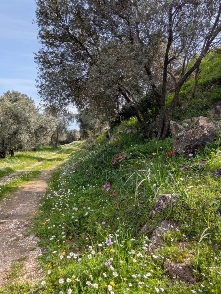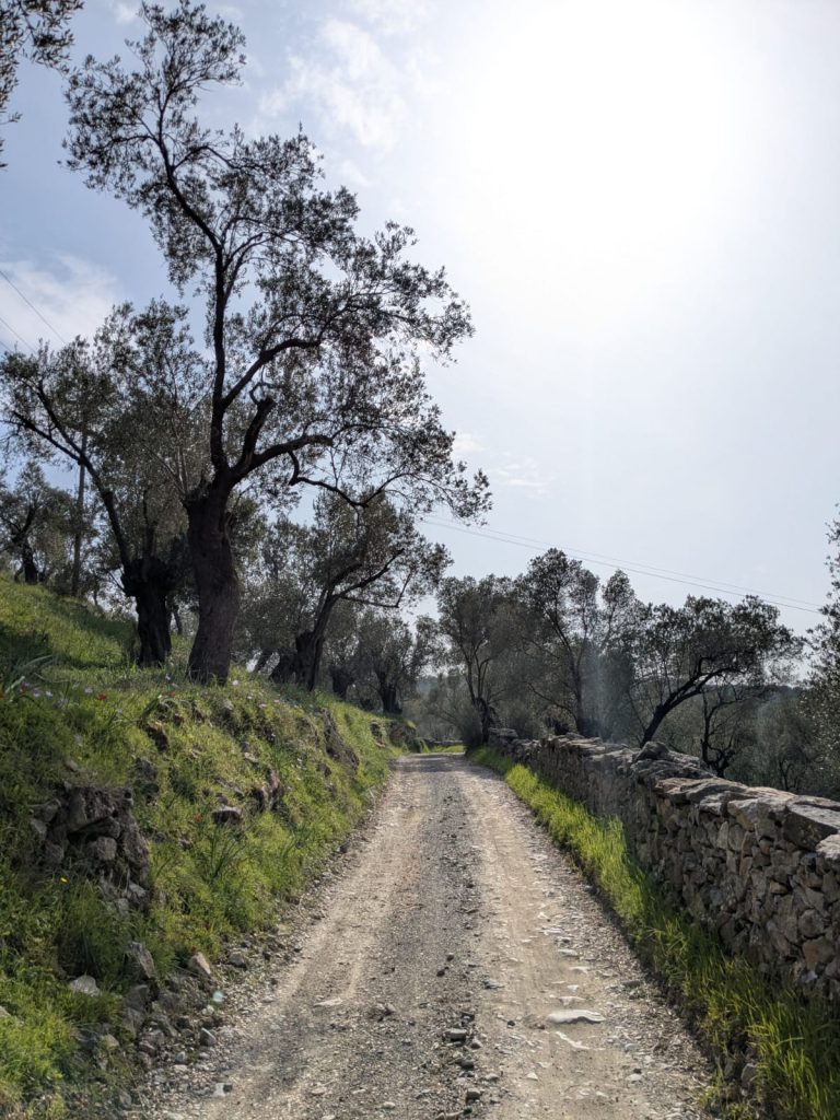 Mijn rondje fietsen was weer fantastisch. Het voelt helemaal avontuurlijk om je eigen weg te zoeken, en toen ik een klein weggetje langs de kust nam werd dat een gravelpad wat behoorlijk steil omhoog ging. Best spannend met race-fiets banden, maar ik heb ondertussen geleerd dat die heel wat aankunnen, en het ging ook goed! Ik moest kleine stukjes afstappen omdat het te steil was met losliggend grind waar ik niet doorheen kwam. Er was verder niemand en overal stonden weer voorjaarsbloemen in de berm, het was echt prachtig. ’s Avonds ging ik uit eten met iedereen die niet werkte, namelijk Barbara (psycholoog), Peter (support crew) en Ine (verpleegkundige). We gingen naar het oudste restaurant van Mytilini, waar ik een heerlijke ‘aubergine imam’ at: aubergine gevuld met knoflook, ui en tomaat en gestoofd in olie.