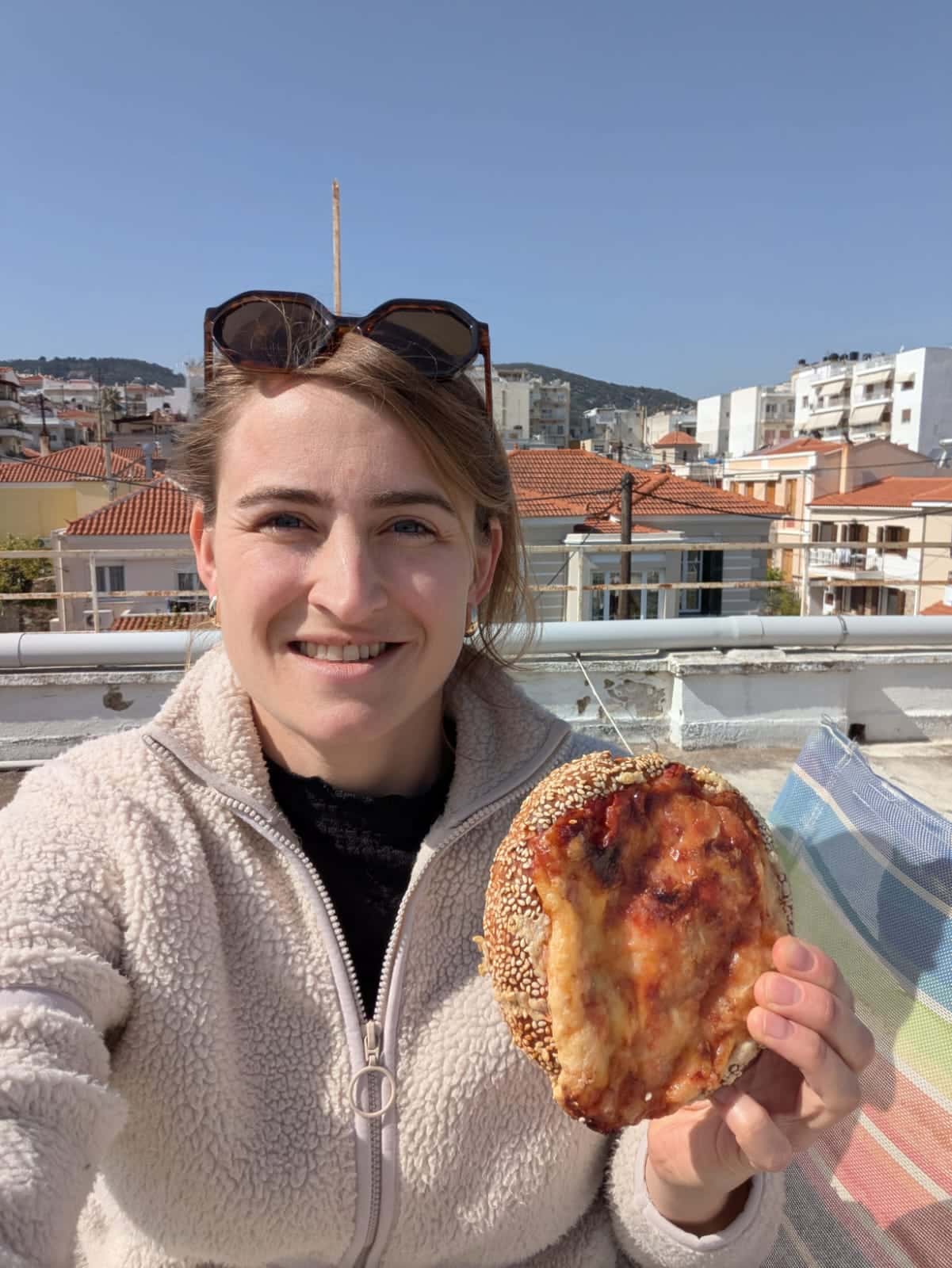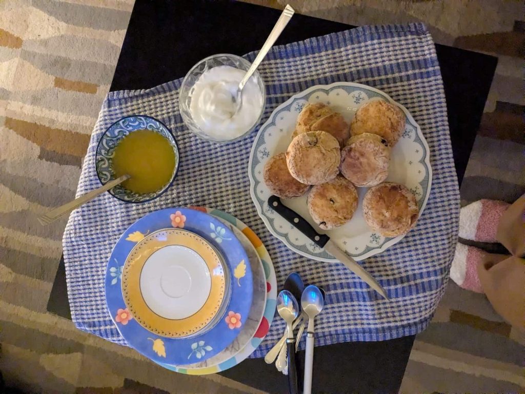 Op de terugweg reden we langs de Lidl, mooi want ik had nog een lijstje voor mijn baksels van vandaag. Terug in Mytilini gauw douchen, tosti’s gemaakt en opgegeten bij Lemon House, en weer aan de bak. Ik begon met vegan lemon curd en daarna vegan scones. Daarbij kreeg ik hulp van de ontzettend lieve Griekse schoonmaakster, die toevallig aan het werk was. Haar Engels is net ietsje beter dan mijn Grieks, want ze wees op zichzelf en zei ‘bread’. Toen begon ze me te helpen het deeg uit te rollen en scones uit te steken, en dat zag er inderdaad heel vakkundig uit! Tot slot probeerde ik vegan clotted cream te maken maar dat was een ramp, dus het werd kokosyoghurt met wat poedersuiker erin. Om 18u begon de grote Bridgerton par-teafeest met de scones, thee, de andere dames in huis en de laatste twee afleveringen van Bridgerton. Het was echt heel knus en gezellig! Wel was ik compleet gesloopt na het voetballen en de hele middag staan bakken, alles was stijf en deed zeer. Hierbij mijn welgemeende excuses aan alle voetballers wie ik tot op heden niet genoeg erkenning heb gegeven voor het leed dat ze na een voetbalwedstrijd ervaren. Ik probeerde nog een spelletje mee te spelen in Lemon House, maar daar bakte ik dan weer niks van ;) dus, lekker naar bed.
