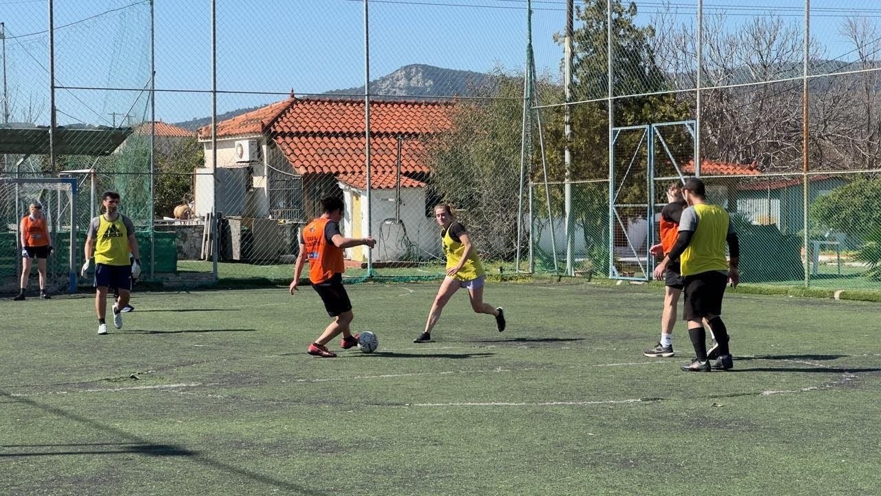 Zaterdagochtend stond er een voetbal-event gepland en daar had ik veel zin in, want het was voor alle leden van het BRF team! We waren uiteindelijk met z’n achten, dus 4 tegen 4. Het was onder andere met 4 mannelijke tolken, een manager, Brandon, Femke en ik. We hadden een veldje afgehuurd, gelukkig kleiner dan een normaal voetbalveld. Maar alsnog was ik al na 20 minuten helemaal oververhit en buiten adem, wat is dat toch mega intensief! Ik koos er toen voor om maar wat minder op en neer te rennen en iets meer aan verdediging te doen, en als ik weer wat energie had ging ik mee naar voren. Ondanks wat gemiste pogingen recht voor doel heb ik 1 keer gescoord! We hebben uiteindelijk 2 uur lang gespeeld, tot de meesten van ons op de grond lagen. Het was echt heel leuk om zo op een andere manier iets met het team te doen dan wanneer we aan het werk zijn. Een aantal van hen vasten nu trouwens vanwege de Ramadan, dus zij mogen overdag ook geen water drinken. Pfoe, ik vind het héél erg sterk van ze. Vlakbij het voetbalveld wees Femke een enorme hoop aan (zie foto): dat zijn alle bootmotoren die op de bootjes zaten die vluchtelingen hebben gebruikt. Er is mij verteld dat zodra vluchtelingen land hebben bereikt, ze direct de bootmotoren onklaar maken en verstoppen, om te voorkomen dat ze direct terug de zee op gestuurd kunnen worden. Maar ook heb ik gehoord dat er bij een push-back op zee, de bootmotor er door de kustwacht afgehaald wordt en de mensen worden teruggesleept naar Turkse wateren, waar ze ronddobberen tot de Turkse kustwacht ze vindt en komt helpen. Blijft onvoorstelbaar, maar ook zijn er een heleboel verschillende vertellingen – dus wat er nu waar is, en wat in welke mate gebeurt?