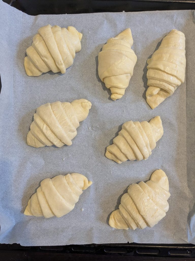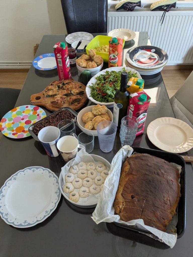 Zaterdag was dus nogal een slome dag, tegen half 12 sleepte ik mezelf uit bed. Ik zette de croissantjes onder de airco voor hun laatste rijs en begon aan mijn speciale paasbrood voor de vervroegde paasbrunch de volgende dag. Daarvoor moest ik behoorlijk kneden en het deeg 100 keer op het aanrecht smijten. Met elke gooi voelde ik me een stukje beter, gelukkig! Helaas wilden de croissantjes niet meer zo erg rijzen, dus gaf ik ze wat langer de tijd – te lang, achteraf. Tegen 16u ging ik ze afbakken in Lemon House, waar schoonmaakster Mira ook weer was. Via Google Translate hebben we een heel gesprek gehad, ze heeft 12 jaar in een bakkerij gewerkt! Ze maakte dagen van 16-18 uur om haar gezin en 3 kinderen te kunnen onderhouden. Toen de croissantjes een tikje plat uit de oven kwamen, kon ze me precies vertellen wat ik fout had gedaan: te lang laten rijzen en de oven was niet heet genoeg geweest. Ze zei dat ik mijn mooie hoofd niet moest vermoeien met zelf croissantjes willen bakken, ik kon ze toch ook gewoon ingevroren kopen en zelf afbakken? Het is een onwijs lief mens, maar hiervan dacht ik ‘laat me nou maar’. Eigenlijk was ik toch best wel trots op die croissants, en ze smaakten heerlijk! Lekker zacht en fluffy, en met de citroenmarmelade helemaal een traktatie. Ondertussen bakte ik ook mijn paasbrood voor de volgende dag, die natuurlijk ook niet perfect was. Maar dat lag gelukkig ook aan de oven, aldus Mira. Zaterdagavond had Peter van de support crew mij, Brandon en Nico uitgenodigd voor een afscheidsetentje. Hij vloog de volgende ochtend vroeg terug naar NL; ik had een croissantje voor hem mee omdat hij de croissant-fanaat was. We aten weer bij het oudste restaurantje van Mytilini en deelden allerlei gerechtjes, die allemaal goede keuzes bleken. Op de terugweg haalden Brandon en ik nog een ijsje bij Sugar House, dan konden we dat alvast van ons lijstje afstrepen. We hebben allebei namelijk nog een lijstje van wat we nog willen doen in onze laatste dagen!