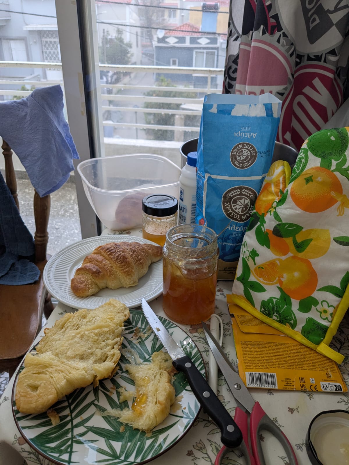 Zaterdag was dus nogal een slome dag, tegen half 12 sleepte ik mezelf uit bed. Ik zette de croissantjes onder de airco voor hun laatste rijs en begon aan mijn speciale paasbrood voor de vervroegde paasbrunch de volgende dag. Daarvoor moest ik behoorlijk kneden en het deeg 100 keer op het aanrecht smijten. Met elke gooi voelde ik me een stukje beter, gelukkig! Helaas wilden de croissantjes niet meer zo erg rijzen, dus gaf ik ze wat langer de tijd – te lang, achteraf. Tegen 16u ging ik ze afbakken in Lemon House, waar schoonmaakster Mira ook weer was. Via Google Translate hebben we een heel gesprek gehad, ze heeft 12 jaar in een bakkerij gewerkt! Ze maakte dagen van 16-18 uur om haar gezin en 3 kinderen te kunnen onderhouden. Toen de croissantjes een tikje plat uit de oven kwamen, kon ze me precies vertellen wat ik fout had gedaan: te lang laten rijzen en de oven was niet heet genoeg geweest. Ze zei dat ik mijn mooie hoofd niet moest vermoeien met zelf croissantjes willen bakken, ik kon ze toch ook gewoon ingevroren kopen en zelf afbakken? Het is een onwijs lief mens, maar hiervan dacht ik ‘laat me nou maar’. Eigenlijk was ik toch best wel trots op die croissants, en ze smaakten heerlijk! Lekker zacht en fluffy, en met de citroenmarmelade helemaal een traktatie. Ondertussen bakte ik ook mijn paasbrood voor de volgende dag, die natuurlijk ook niet perfect was. Maar dat lag gelukkig ook aan de oven, aldus Mira. Zaterdagavond had Peter van de support crew mij, Brandon en Nico uitgenodigd voor een afscheidsetentje. Hij vloog de volgende ochtend vroeg terug naar NL; ik had een croissantje voor hem mee omdat hij de croissant-fanaat was. We aten weer bij het oudste restaurantje van Mytilini en deelden allerlei gerechtjes, die allemaal goede keuzes bleken. Op de terugweg haalden Brandon en ik nog een ijsje bij Sugar House, dan konden we dat alvast van ons lijstje afstrepen. We hebben allebei namelijk nog een lijstje van wat we nog willen doen in onze laatste dagen!